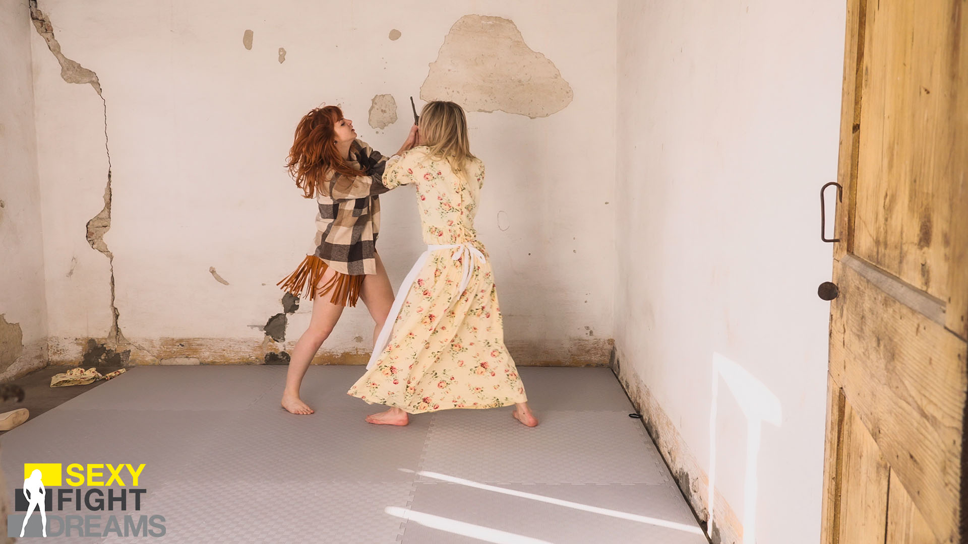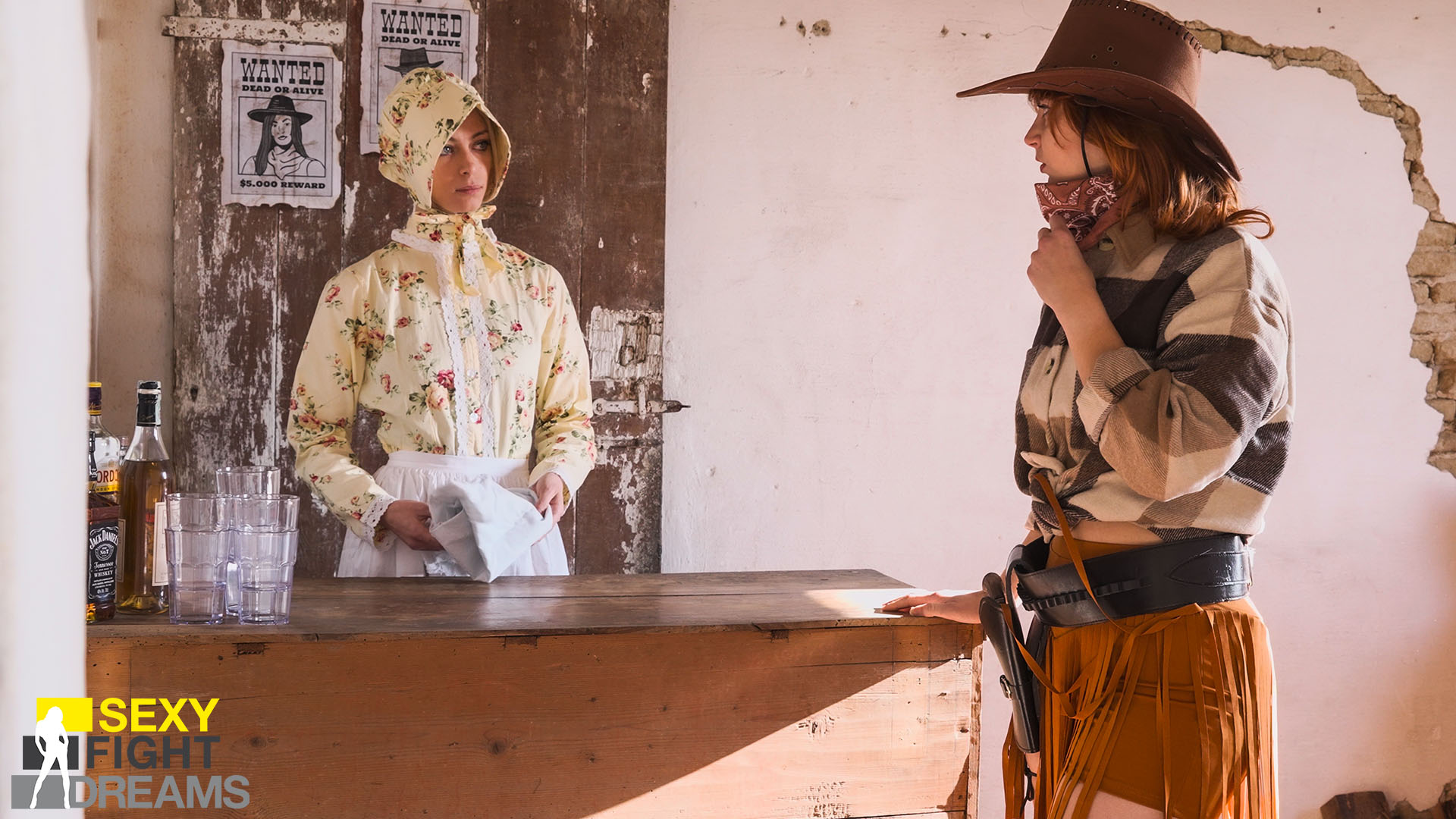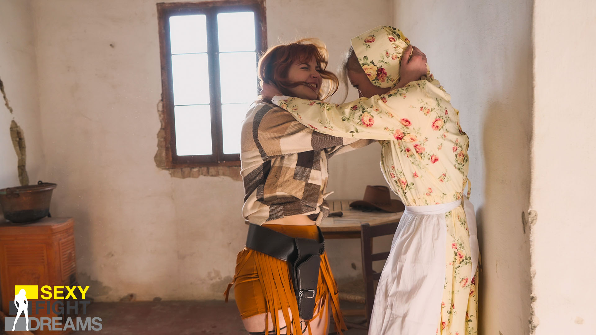 In the Old West, problems are solved with fists. Luna and Olivia tear into each other without rules: punches to the face and belly, brutal chokes, hair-pulling, scissors—everything a proper tavern catfight demands. Olivia’s reputation is well earned… but Luna was hiding a real beast behind that sweet damsel façade.